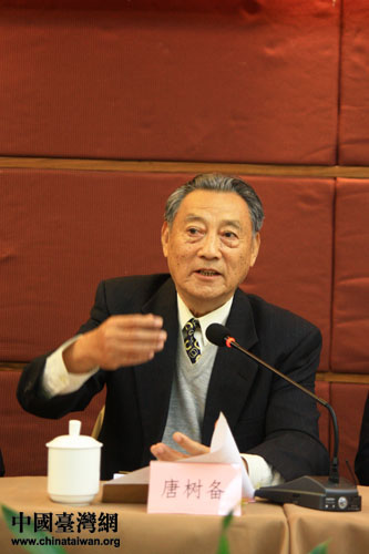 北京聯(lián)大臺(tái)研院名譽(yù)院長、原海協(xié)會(huì)常務(wù)副會(huì)長唐樹備在會(huì)上發(fā)言。(中國臺(tái)灣網(wǎng) 扶海濤 攝)