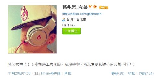就在前天(19日)晚間一直到第二天凌晨,寶弟又再一次被平面媒體直擊出沒在臺北市東區的夜店,他似乎也發現自己被跟拍,于20日的凌晨1:06在微博留言道:“我又被拍了!!走在路上被狂跟。我沒干么,所以看到報道不用大驚小怪。”父親生病,他卻還有心情上夜店?而且重點是未成年的他怎么能在外頭搞到快1點還在玩樂,實在叫人傻眼。(中國臺灣網 周劍)