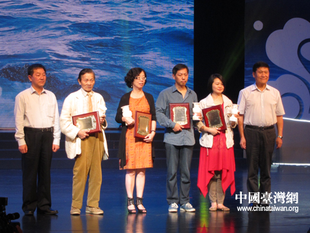 國臺(tái)辦副主任葉克冬及海南省委副書記李憲生為獲獎(jiǎng)詩人頒獎(jiǎng)。左起:葉克冬、羅門、舒婷、潘維、顏艾琳、李憲生。(中國臺(tái)灣網(wǎng) 薛白璐 攝)