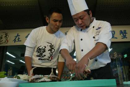 廚師教導(dǎo)阮經(jīng)天如何“宰蟹”。圖片來自臺媒