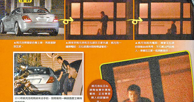 去年10月姚元浩稱與王心凌幾乎沒有聯絡,王心凌在圣誕節前夕為演唱會定裝時也稱與姚元浩已沒聯絡。但昨出刊的《壹周刊》卻爆料去年12月14日拍到姚元浩自由進出王家,跨年當天更拍到他將銀色奔馳直接開進可看臺北101煙火的王家,與友人在王家開趴,2人還趁著等煙火空檔,走到窗邊看夜景,姚從后面環抱她、她則把頭靠在他的胸膛。