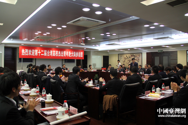 全國政協常委、民革中央副主席、中華中山文化交流協會副會長鄭建邦在北京會見了“第十二屆臺灣高校杰出青年赴大陸參訪團”一行,并與“杰青團”就兩岸之間的交流問題展開座談。(中國臺灣網 芮益芳 攝)