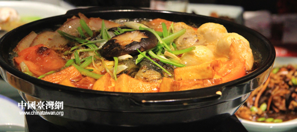 火鍋永遠是用來壓軸的。沙茶是閩南臺灣一代民眾喜愛的口味。熱氣騰騰的火鍋中,用臺灣秘制沙茶醬烹煮臘肉、魚丸、貢丸、香菇,再加上北京密云水庫的水庫魚。最大程度還原了原汁原味的“臺菜”味道。 (圖文/李徽)