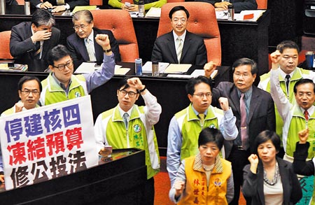 中國(guó)臺(tái)灣網(wǎng)2月27日消息 據(jù)臺(tái)灣《中國(guó)時(shí)報(bào)》報(bào)道,臺(tái)當(dāng)局“行政院長(zhǎng)”江宜樺日前宣布將核四停建與否交付全民“公投”,再為延燒多時(shí)的核四爭(zhēng)議投下強(qiáng)力震撼彈,臺(tái)灣“立法院院會(huì)”昨(26日)天也因此近乎停擺。經(jīng)多次協(xié)商后,朝野黨團(tuán)最終達(dá)成共識(shí),核四工程除已發(fā)包及安全檢測(cè)工作外,暫停施工;“公投”之前,核四不得辦理追加預(yù)算或放置燃料棒。至于“公投”門(mén)檻是否下修,則需于舉行“公投”前,由朝野協(xié)商決定。