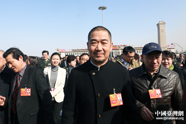 開幕會舉行前,政協委員張國立在人民大會堂前遭遇各路記者圍追堵截。(中國臺灣網 于斯文 攝)