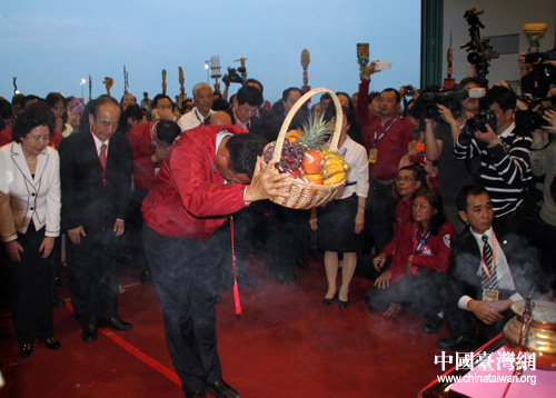 臺(tái)灣鴻海科技集團(tuán)董事長郭臺(tái)銘敬獻(xiàn)果籃(中國臺(tái)灣網(wǎng) 李典典 攝)