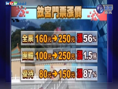 臺北故宮日前宣布票價即將漲價,普通票自160元(新臺幣,下同)漲到250元,優惠票從80元調漲到150元,漲幅8成。團體票漲更兇,從100元漲到250元,更是漲了1.5倍。