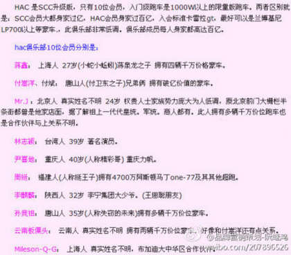網絡流傳跑車俱樂部名單。(圖片來自臺媒)