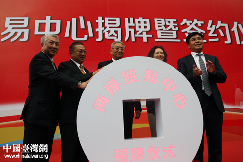 商務(wù)部臺港澳司司長陳星、廈門市人民政府副市長張燦民、海峽兩岸關(guān)系協(xié)會副會長張銘清、臺灣兩岸共同市場基金會理事長詹火生、臺灣工商協(xié)進(jìn)會理事長駱錦明出席儀式,并為兩岸貿(mào)易中心總部揭牌。(中國臺灣網(wǎng) 王思羽 攝)