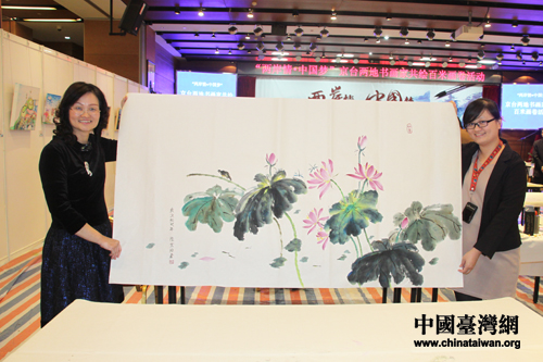 臺灣工筆彩墨畫家陸金招展示她的現場畫作。(中國臺灣網 郭慶娜 攝)