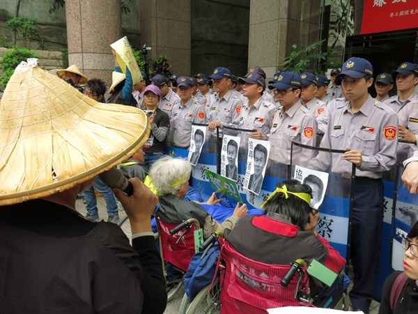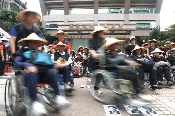 “全臺(tái)關(guān)廠工人連線”昨天上午由工人乘坐數(shù)十臺(tái)輪椅,以行軍方式走28公里路,前往新北地方法院、桃園地方法院,訴求關(guān)廠工人和保人遭起訴案,要求地方法院并案處理。同時(shí)將工人親手折的紙錢蓮花燒掉,表示請土地公及關(guān)圣帝君代轉(zhuǎn)給“死要錢”的臺(tái)“勞委會(huì)”。