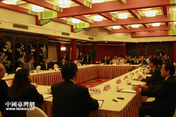 在兩岸企業家峰會秘書處,張志軍與在江蘇投資的臺商代表進行了座談,了解臺資企業經營情況,聽取他們對兩岸產業和企業合作的意見。