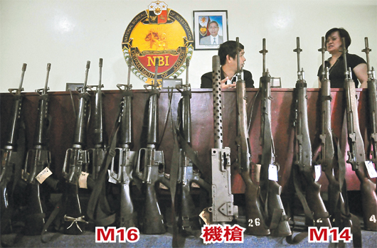 菲律賓國(guó)家調(diào)查局17日在馬尼拉總部召開(kāi)記者會(huì)前,展示一批由菲律賓海岸防衛(wèi)隊(duì)交給調(diào)查人員的武器,菲律賓槍擊臺(tái)灣漁船廣大興28號(hào)的武器就在其中。圖中為布朗寧機(jī)槍,左邊七把為M16步槍,右方六把為M14步槍,這兩型槍枝在越戰(zhàn)時(shí)期均被廣泛使用。(圖片來(lái)自臺(tái)媒)
