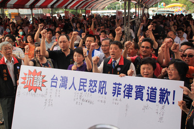 臺灣民眾游行示威,抗議菲律賓公務船射殺臺灣漁民及菲政府在這一事件中的處理態度。(圖片來源:臺灣“中央社”)
