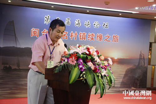 來自臺灣臺南市安平區(qū)的里長傅建峰在“閩臺同名鄉(xiāng)鎮(zhèn)續(xù)緣之旅啟動儀式”上致詞(中國臺灣網(wǎng)記者 蕪?fù)?nbsp;攝)