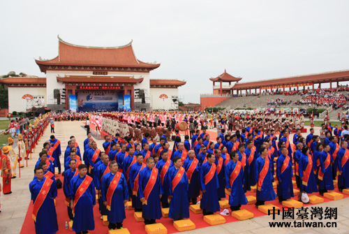 6月14日上午,來自臺灣179家媽祖宮廟的970名信眾代表在湄洲祖廟天后廣場參加了媽祖祭祀大典。(中國臺灣網 樊玉嬌 攝)