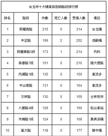 在十大危險路段中,最危險的要數(shù)民權(quán)西路,此路段銜接臺北大橋至新北市,為上班族上下班的必經(jīng)要道,非常容易因人員擁擠致使發(fā)生交通事故,而中正路銜接百齡橋至新北市,也因路段人流量高致使出事幾率增加,此外,其它路段則因為臨近重要場所或車流量高而事發(fā)頻繁。