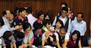 中國臺灣網6月25日消息 據臺灣媒體報道,臺當局“立法院”今天舉行臨時會,在野黨昨揚言杯葛議事、反對國民黨護航兩岸服務貿易協議,未料藍軍一早提前攻占主席臺,場面非;鸨。除民進黨“立委”姚文智與國民黨“立委”王惠美發生推擠,更傳“綠委”林淑芬欲潑藍軍咖啡,結果潑到同黨“立委”何欣純。