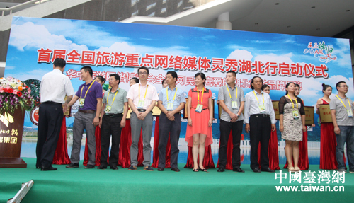 全國網民評選湖北最受歡迎的旅游品牌代表接受授牌。(中國臺灣網 李杰 攝)