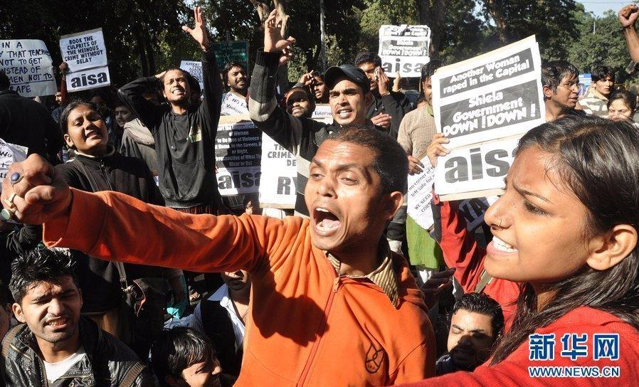 2012年12月19日,印度新德里,印度人民黨的女成員游行譴責(zé)女生在公交車上被輪奸的事件。2012年12月16日晚一名23歲的醫(yī)學(xué)女生在德里南部與其男性朋友一起乘公交時,車上包括司機在內(nèi)的7名男子對兩人進行毆打,并輪奸了女生,之后將二人扔出公交車逃逸。圖片來源:新華網(wǎng)