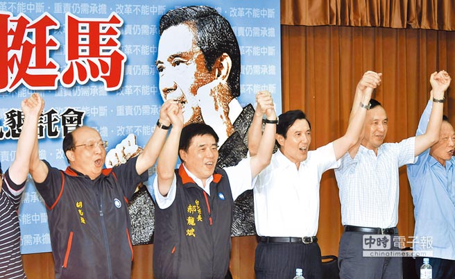 郝朱胡挺馬,馬英九(上圖中)為連任國民黨主席全力沖刺,懇托會上臺北市長郝龍斌(左二)、新北市長朱立倫(右二)及臺中市長胡志強(左)聯(lián)袂力挺高票連任。圖片來源:臺灣《中國時報》