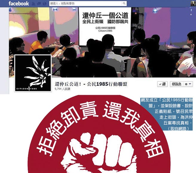 臺灣網友成立“公民1985行動聯盟”,并架設臉書、設計正義貼紙,號召民眾走上街頭,為洪仲丘案尋找真相。圖片來源:臺灣《中國時報》