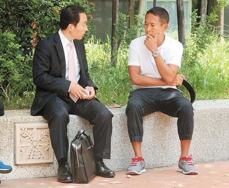 鈕承澤(右)與律師討論案情(圖片來自臺灣《中國時報》)
