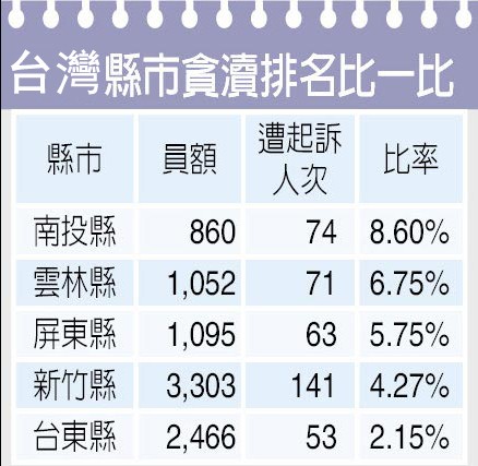 若以縣市政府機(jī)關(guān)員額,換算該單位公務(wù)員因貪腐遭起訴比例,南投縣則躍居第一名。在860位預(yù)算員額內(nèi),過去5年間,南投縣有74人因貪腐遭起訴,平均每100人中有8.6人遭起訴。