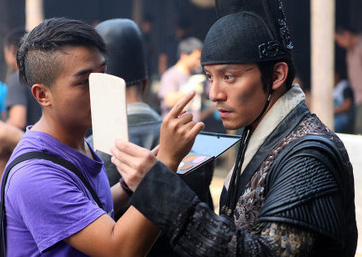 張震(右)趁著拍戲空檔檢查自己妝容。(圖片來自臺媒)