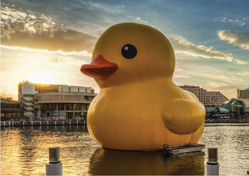 小鴨浮臺是一座圓形金屬結構,外圈直徑15米,由4只大型浮管提供浮力,支撐18米高、1噸重的黃色小鴨。霍夫曼對于浮臺技術要求很高,浮臺外圈與海平面的高低落差要控制在1到3公分,因此在浮力計算上必須精確。