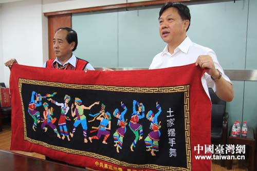 王海濤州委書記向臺灣少數民族參訪團贈送“西蘭卡普”(中國臺灣網 雍紫薇 攝)