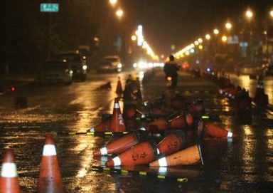 十全路上的整排警示路障被吹的東倒西歪。(圖片來自臺媒)