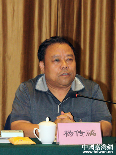 新疆生產建設兵團臺辦巡視員楊傳鵬主持座談會并致辭。(中國臺灣網 王偉 攝)