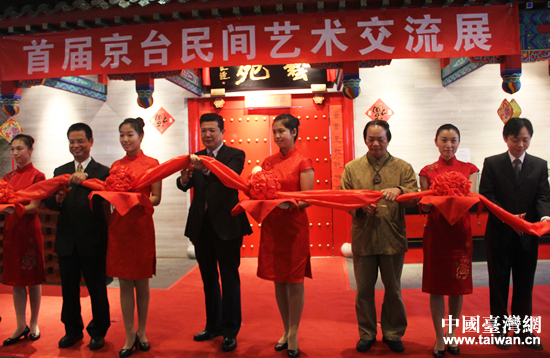 首屆京臺民間藝術交流展于2013年9月26日隆重開幕,北京市臺辦、北京市臺聯、中華青年企業家協會、北京大碗茶文化發展有限公司、北京老舍茶館有限公司的領導和嘉賓出席剪彩儀式。(中國臺灣網 楊永青 攝)