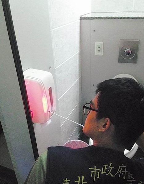 警方鑒識(shí)人員持儀器,在該大樓女廁察看有無遭裝偷拍器材。(圖片來自臺(tái)媒)