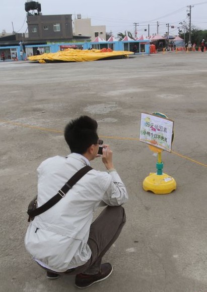 民眾蹲在地上拍扁鴨和告示牌。(臺媒圖)