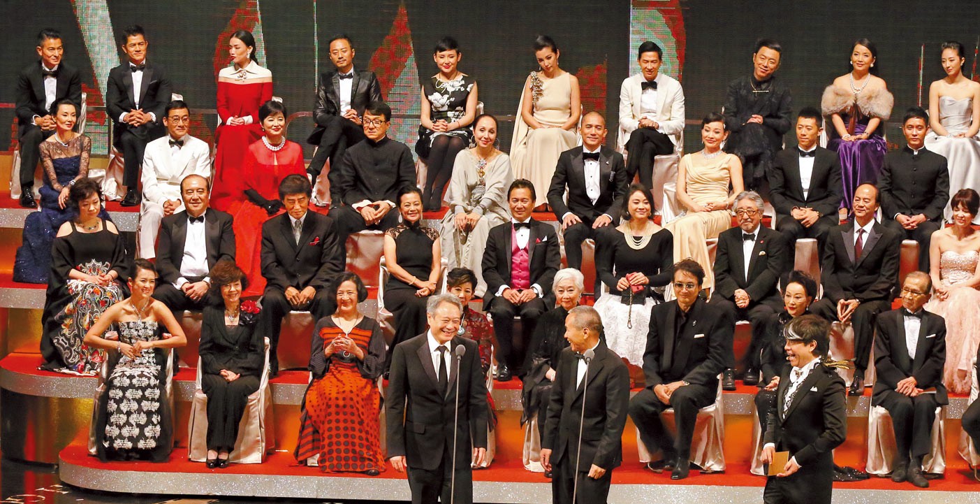 李安(前排左起)、侯孝賢和蔡康永一起和40位歷屆金馬帝后在臺上頒最佳影片獎,畫面震撼人心。第2排左起依序為章子怡、歸亞蕾、江青、凌波、盧燕、秦祥林、徐楓、常楓、李康生。第3排左起依序為陳秋霞、柯俊雄、王冠雄、張艾嘉、艾迪、陸小芬、孫越、狄龍、鄭裕玲。第4排左起依序為張曼玉、梁家輝、林青霞、成龍、陳令智、梁朝偉、陳沖、夏雨、謝君豪、秦海璐、楊貴媚。第5排左起依序為 劉德華、郭富城、舒淇、張涵予、劉美君、李冰冰、張家輝、黃渤、呂麗萍、桂綸鎂、劉青云。(臺媒圖)