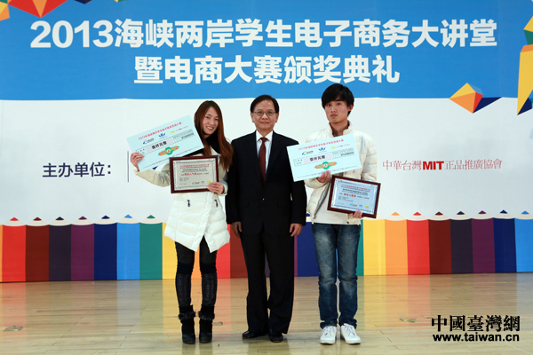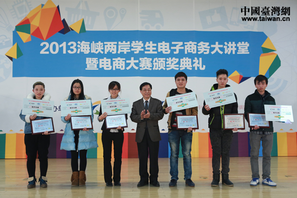 20日下午,由中國臺灣網(m.wxdmx.com)、海峽兩岸互聯網交流委員會、中華臺灣MIT正品推廣協會主辦的“2013海峽兩岸學生電子商務大講堂暨電商大賽頒獎典禮”在京舉行。圖為中華臺灣MIT正品推廣協會榮譽理事、瑞可集團總裁涂鄂良與兩岸獲獎學生代表合影。(中國臺灣網 于斯文 攝)