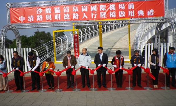 臺中國際機場前人行陸橋,經費1.2億(新臺幣,下同),最后以8000多萬完成。其中,中央塔高31米,橋寬7米,全長163米。因為夠寬,可以牽著自行車過橋。胡志強說,當初顏清標“立委”爭取1.2億興建人行陸橋,如果是市政府,就不可能。完成后,不僅方便公明初中學生穿越車多的中清路,也要讓臺中航空城的發展越來越快。