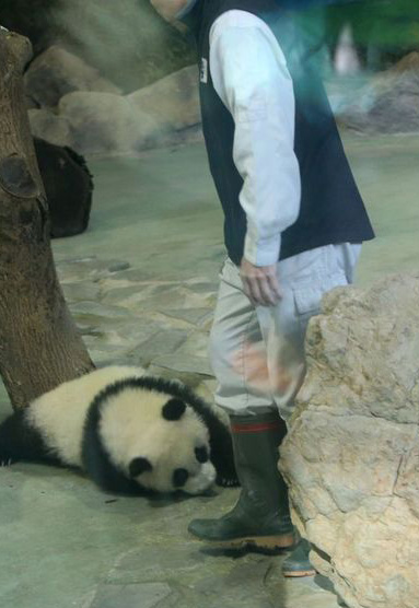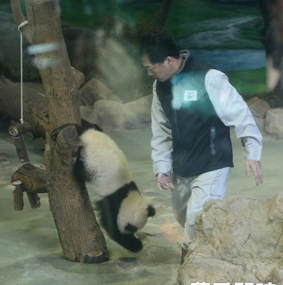 早上8時(shí)50分、“上班”時(shí)間,圓仔從進(jìn)入熊貓舍的小門探出頭來,但隨即縮回去,保育員用紅色尼龍繩引誘“圓仔”,它還是不肯出來。早上9時(shí)2分,保育員折騰良久,終于把她抱出場放在棲架上,小家伙馬上跳下來要跟保育員回去,因此摔下棲架來。保育員之后在展場繞了1圈,“圓仔”也跟緊追著他后邊跑,保育員只好把“圓仔”放上稍高的棲架,然后趕快跑掉。