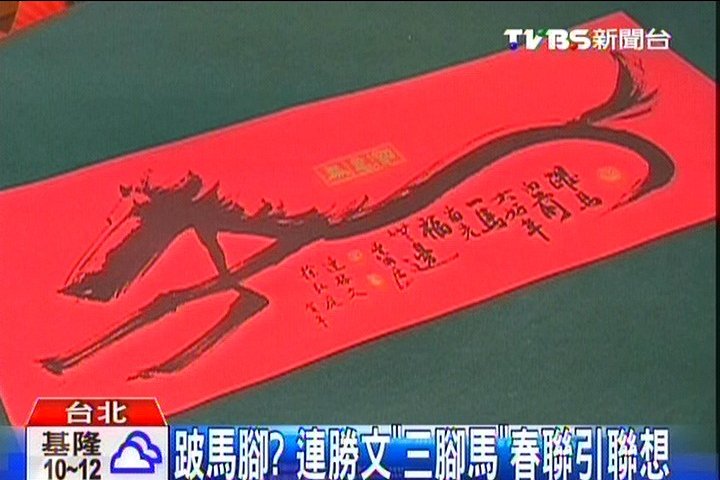 中國臺(tái)灣網(wǎng)1月21日消息 據(jù)臺(tái)灣TVBS新聞報(bào)道,今年逢馬年,政治人物春聯(lián)當(dāng)中的“馬”字怎么寫,格外受到注目。連勝文的春聯(lián)當(dāng)中有個(gè)大大的馬字,但是這馬卻是只“三腳馬”,怎么算都只有3條腿,有人說是不是有跛馬腳的意味?連勝文特助解釋,這三腳馬春聯(lián)是出自名師之手,可以看成馬,也可以看成如意的如,所以才會(huì)長得比較特別。