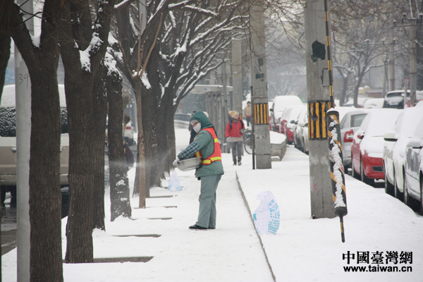 環(huán)衛(wèi)工人在拋灑融雪劑。(中國(guó)臺(tái)灣網(wǎng) 王文英攝)