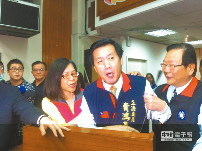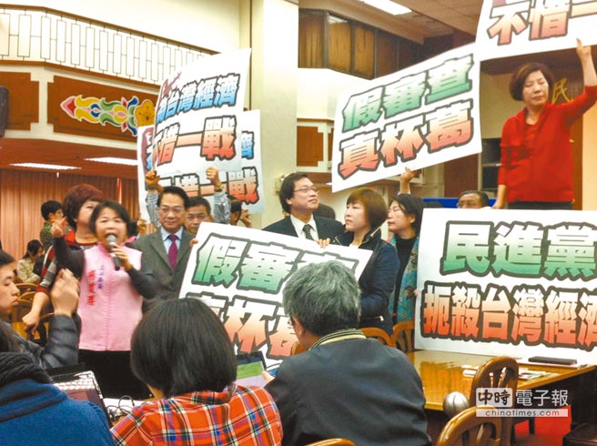 《服貿協議》初審第1天,藍綠陣營一早便因登記發言問題爆發口角,雙方在會場互相叫囂,藍營批綠營“假審查,真杯葛”。(圖片來源:臺灣中時電子報)