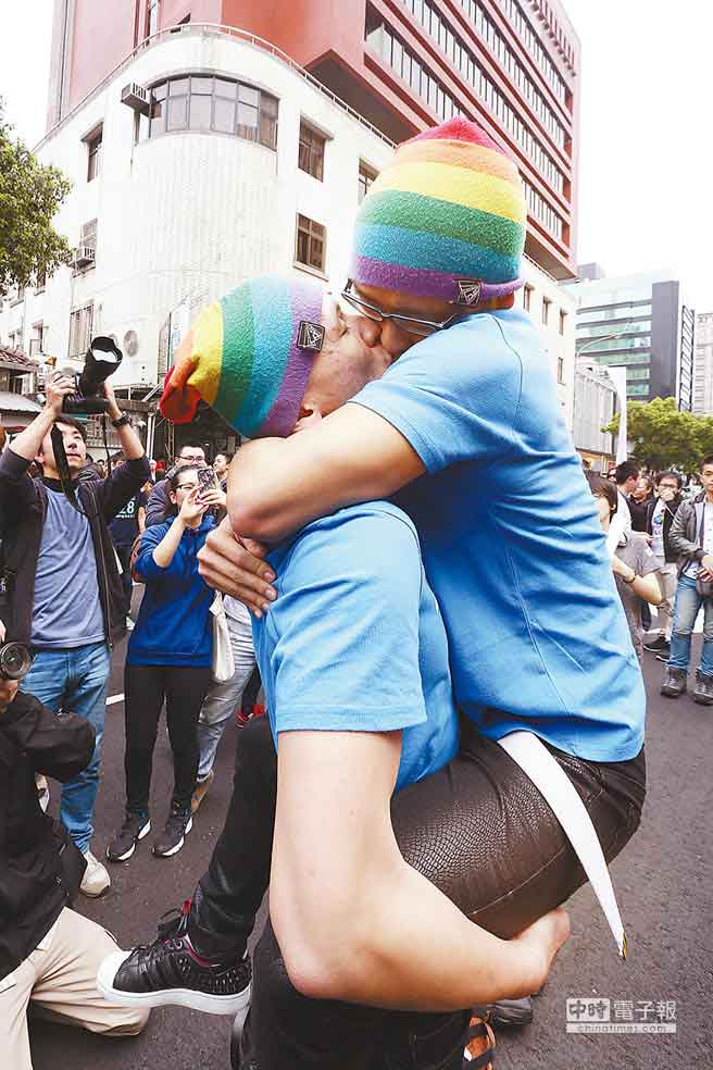 數百民眾16日中午不分“異同”于臺北濟南路“街吻”,力挺婚姻平權。(圖片來源:臺灣中時電子報)