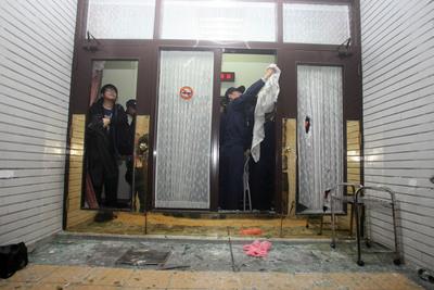 打破議場側門?棺h學生18日晚間突破“立法院”側門的警力,學生打破玻璃門沖入議場。圖為警方清理玻璃門碎片,避免刮傷人。(圖片來源:臺灣“中央社”)