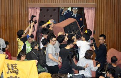 反服貿學生18日晚間突破“立法院”側門的警力,沖入“立法院”議場抗議,拿椅子堵住議場出入口,與警方對峙。(圖片來源:臺灣“中央社”)