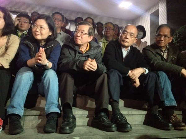蘇貞昌在議場外與蔡英文、謝長廷、游錫堃一起坐下來。(臺媒圖)