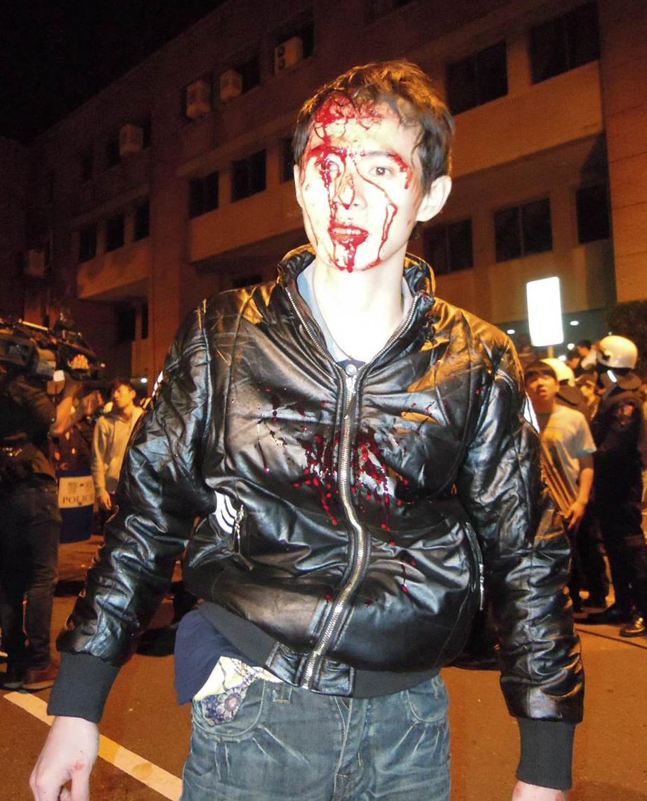 隨后第二波學生直沖院區后門,和警方對峙。此時,有學生觸電受傷,還有學生從高處摔下,8時40分左右,救護車開進“行政院”,把受傷學生載走。
