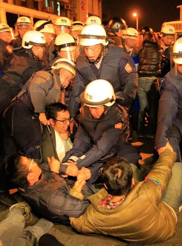 晚上約10時,“行政院”主建筑物大木門被拆下。苦守的警員見大勢已去,表情無奈,但仍試圖阻擋,爆發一波波推擠,混亂中多名警員和學生受傷,逾30人送醫。