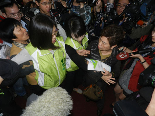 中國(guó)臺(tái)灣網(wǎng)4月2日消息 據(jù)臺(tái)灣“中央社”報(bào)道,民進(jìn)黨籍“立委”今天擋在排定審查服貿(mào)的會(huì)議室外,多位國(guó)民黨籍“立委”欲進(jìn)入開會(huì),一度爆發(fā)推擠叫罵,最后仍不得其門而入。